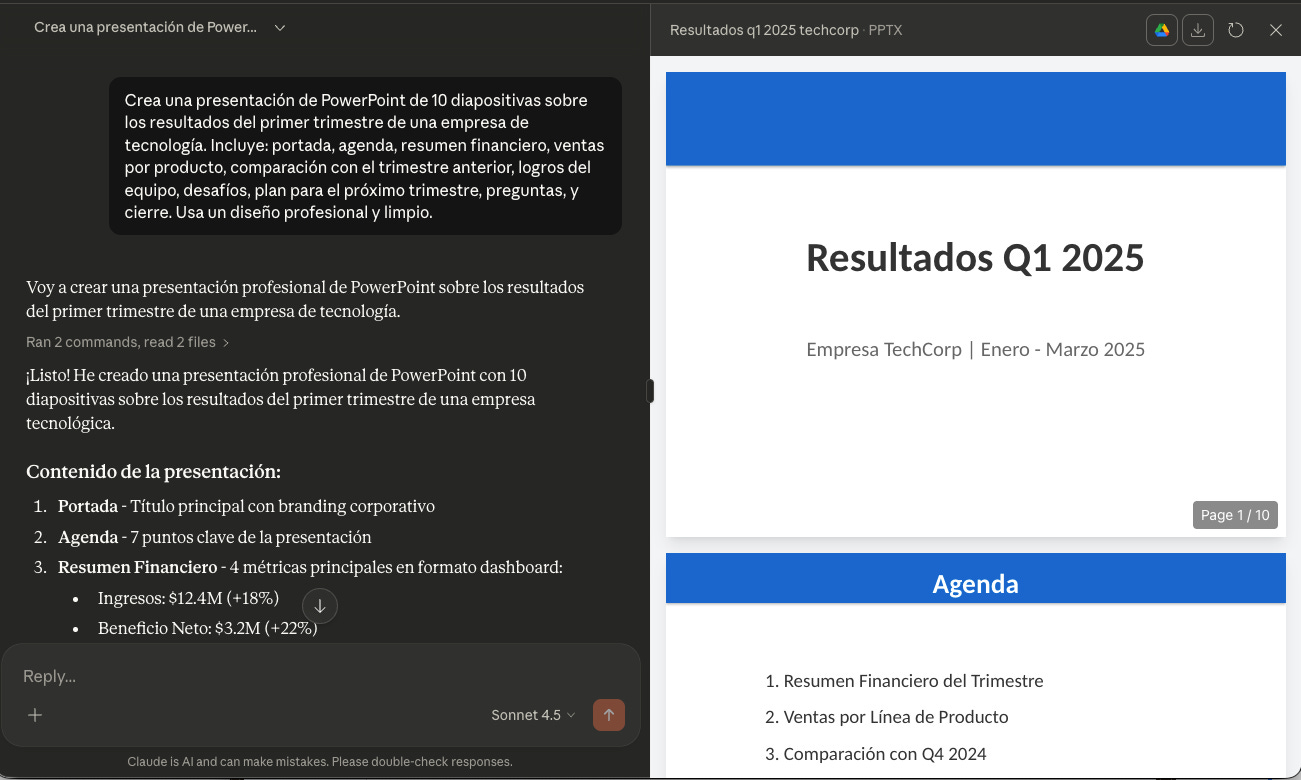Por qué funciona: Claude no solo pone texto en diapositivas. Organiza la información con lógica de presentación (introducción → desarrollo → cierre), que es lo que más tiempo te quita cuando la haces manual.