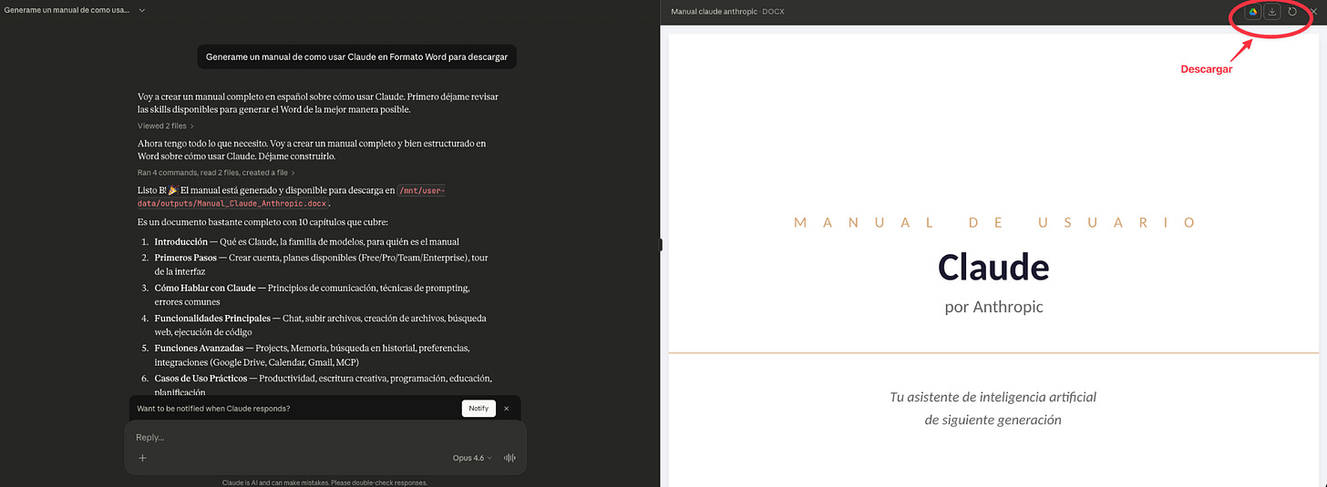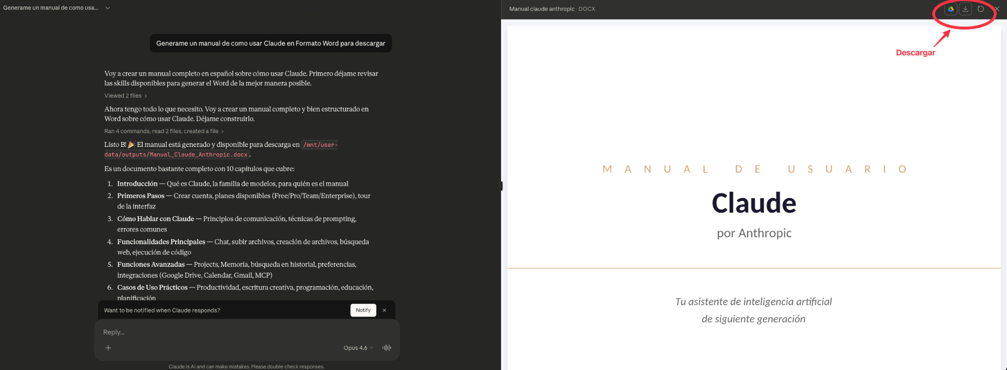 Escríbele en español. Dile que te cree un archivo. Él lo genera y te aparece en un panel a la derecha, listo para descargar.