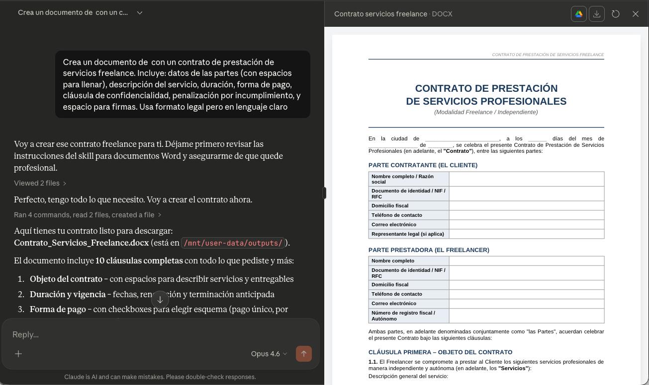 Prompt que funciona: “Crea un documento de con un contrato de prestación de servicios freelance. Incluye: datos de las partes (con espacios para llenar), descripción del servicio, duración, forma de pago, cláusula de confidencialidad, penalización por incumplimiento, y espacio para firmas. Usa formato legal pero en lenguaje claro.”