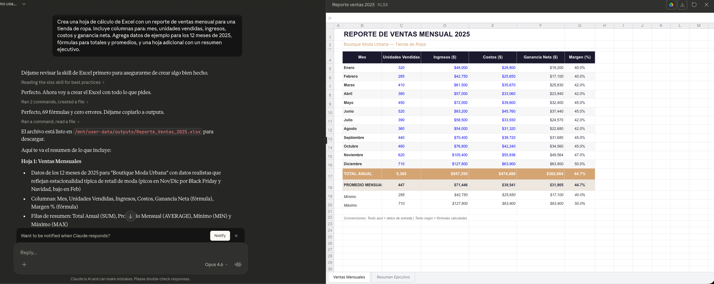 Prompt que funciona: “Crea una hoja de cálculo de Excel con un reporte de ventas mensual para una tienda de ropa. Incluye columnas para: mes, unidades vendidas, ingresos, costos y ganancia neta. Agrega datos de ejemplo para los 12 meses de 2025, fórmulas para totales y promedios, y una hoja adicional con un resumen ejecutivo.”